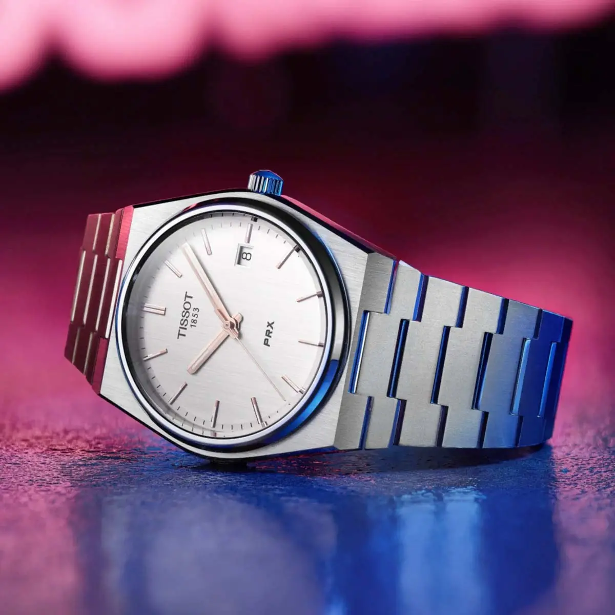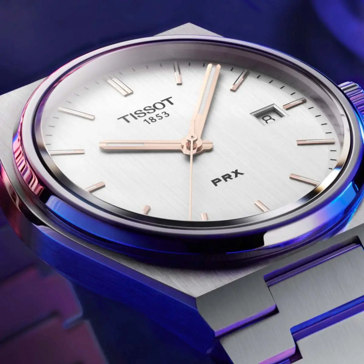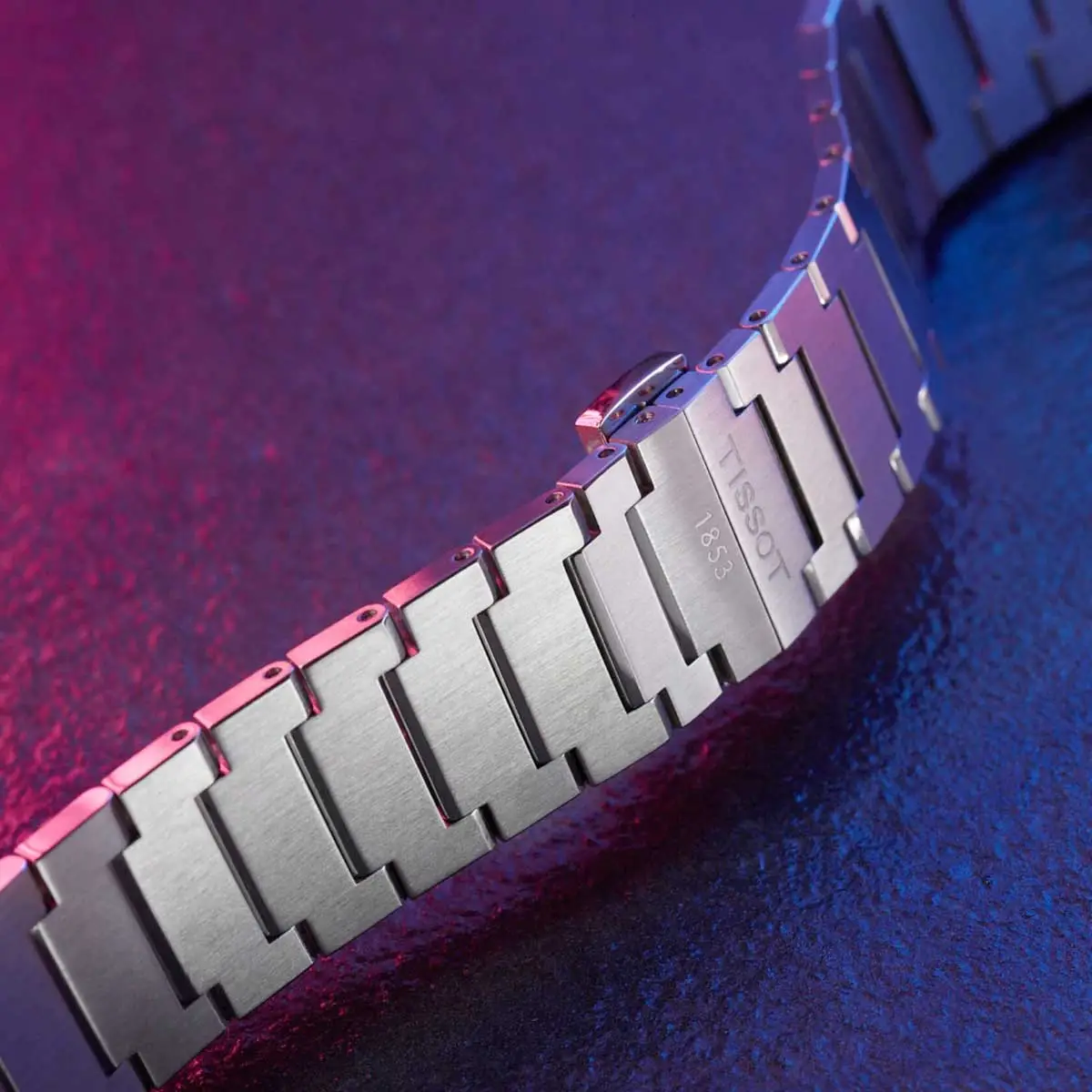 Die Tissot PRX T137.410.11.031.00 vereint Retro-Eleganz der 70er-Jahre mit moderner Schweizer Präzision. Das 40-mm-Edelstahlgehäuse mit integriertem Armband wirkt stilvoll und zeitlos. Das silberne, vertikal gebürstete Zifferblatt mit polierten Indizes und leuchtenden Zeigern wird durch ein Saphirglas mit Antireflexbeschichtung geschützt und sorgt für hervorragende Ablesbarkeit.