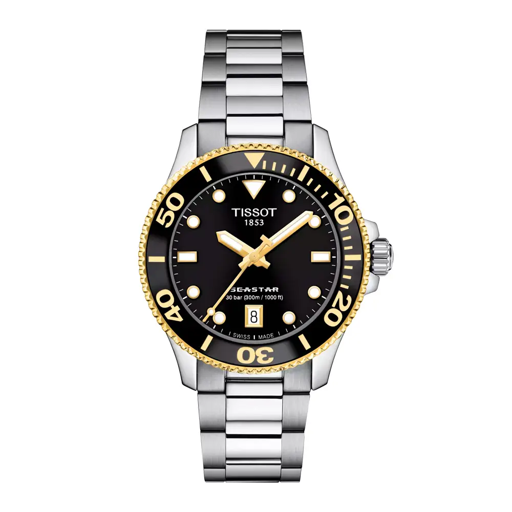 Das Design wird durch ein schwarzes Sunburst-Zifferblatt mit leuchtenden Zeigern und Indexen abgerundet, die eine ausgezeichnete Lesbarkeit auch bei schlechten Lichtverhältnissen gewährleisten. Die einseitig drehbare Lünette unterstreicht den Tauchercharakter, während das Edelstahlarmband mit Butterfly-Schließe für Komfort und sicheren Halt sorgt. Die Tissot Seastar 1000 bietet eine perfekte Kombination aus Schweizer Qualität, Stil und Haltbarkeit im kompakten 36-mm-Format.