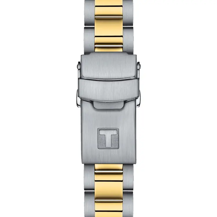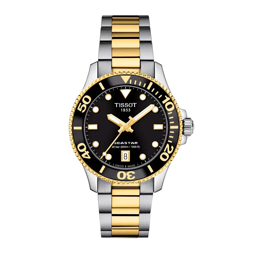 Die Tissot Seastar 1000 36mm T120.210.22.051.00 vereint Taucherleistung, Schweizer Präzision und elegante Ästhetik in einem kompakten Design. Das 36-mm-Edelstahlgehäuse (316L) mit zweifarbiger Gelbgold-PVD-Beschichtung wird durch ein schwarzes Zifferblatt mit Leuchtzeigern und -indizes ergänzt, das auch unter Wasser hervorragende Ablesbarkeit bietet.