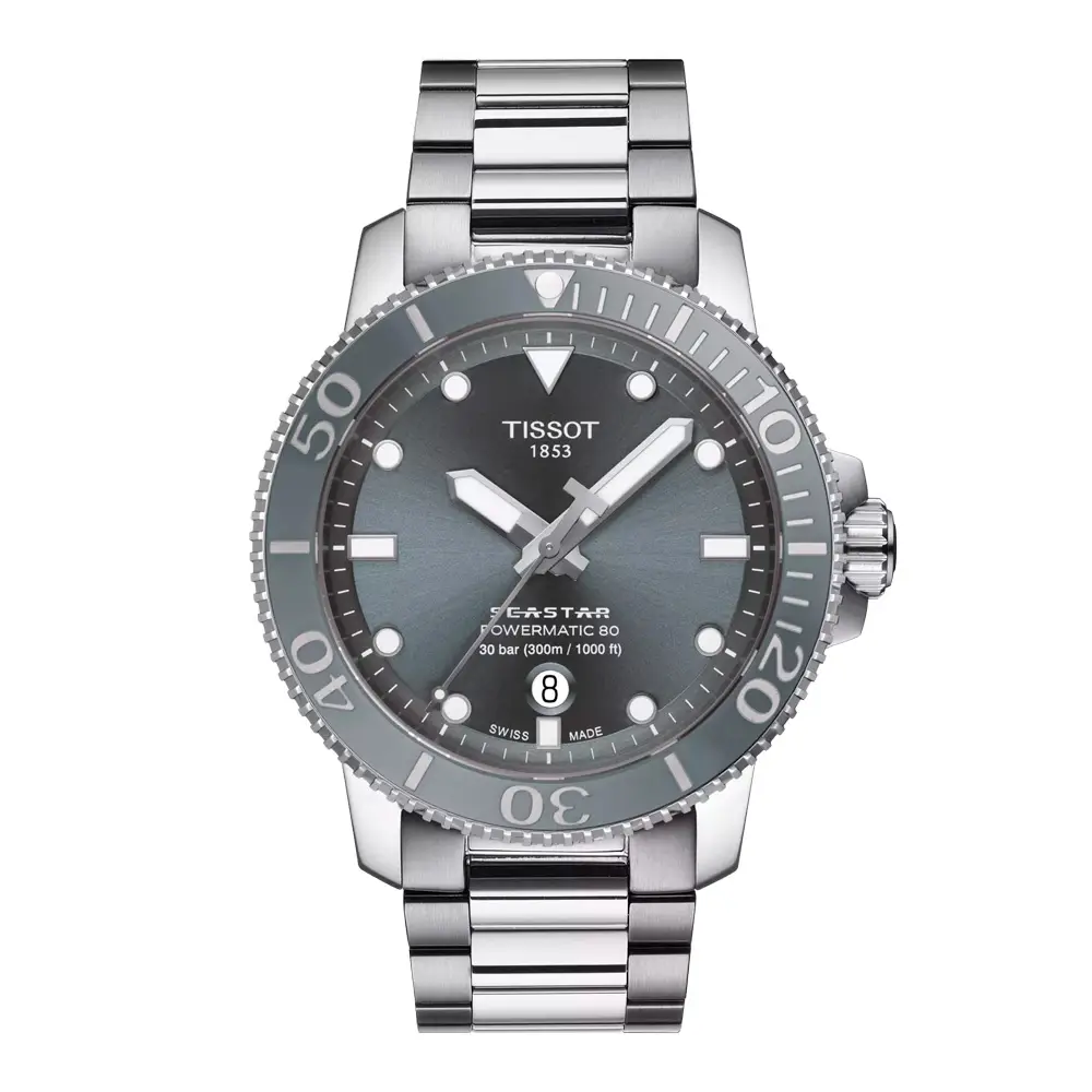 Mit 300 Metern (30 bar) Wasserdichtigkeit und einem Edelstahlarmband mit Sicherheitsfaltschließe ist die Tissot Seastar 1000 Powermatic 80 T120.407.11.081.01 die ideale Wahl für Herren, die eine elegante, robuste und leistungsstarke Taucheruhr suchen, die Schweizer Qualität und modernen Stil vereint.