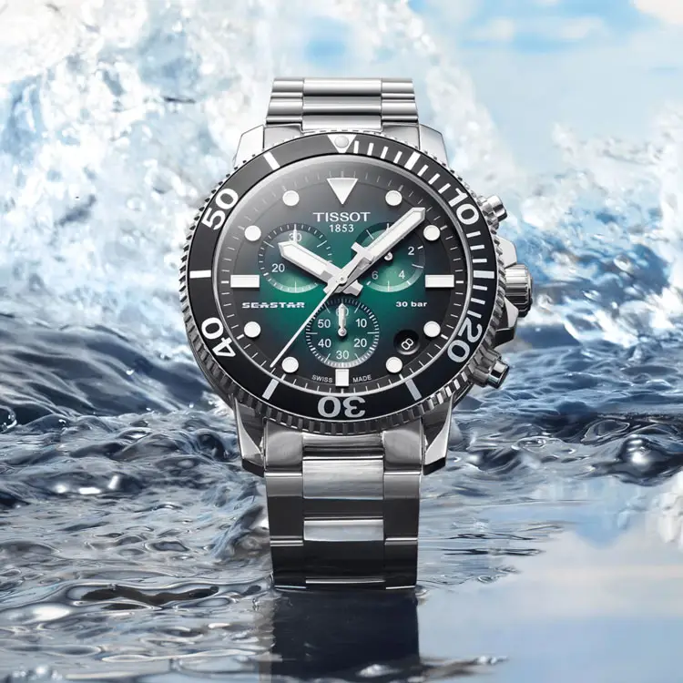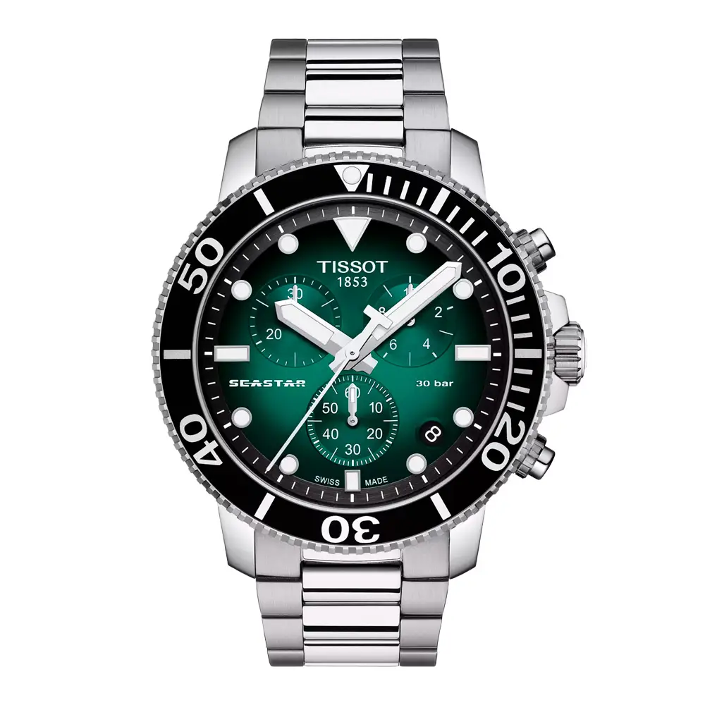 Die Tissot Seastar 1000 Quartz Chronograph ist eine robuste Sportuhr für Taucher und Wassersportler. Sie verfügt über ein 45,5 mm Edelstahlgehäuse, ein grünes Zifferblatt mit Sonnenschliff und eine einseitig drehbare Aluminiumlünette. Verschraubte Krone und Drücker sorgen für eine Wasserdichtigkeit bis zu 300 Metern (30 ATM).