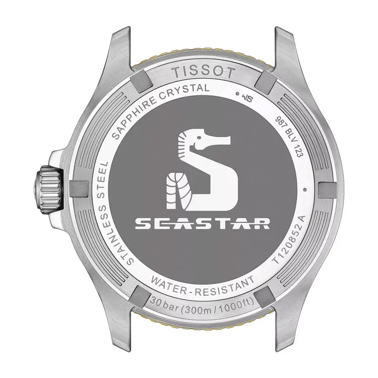 Die Tissot Seastar 1000 Quartz GMT T120.852.22.051.00 vereint professionelle Tauchertechnik mit der praktischen GMT-Funktion für eine zweite Zeitzone. Das 40-mm-Edelstahlgehäuse (316L) mit zweifarbiger PVD-Beschichtung verfügt über eine drehbare 24-Stunden-Lünette und ein schwarzes Zifferblatt mit markanten, leuchtenden Indizes für optimale Ablesbarkeit – über und unter Wasser.