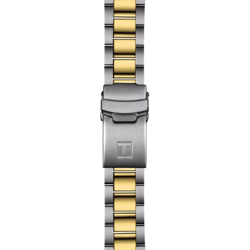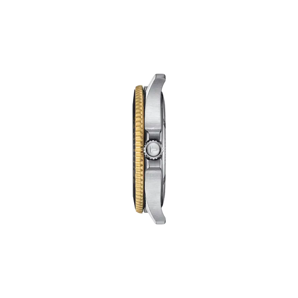 Die Tissot Seastar 1000 Quartz ist eine ikonische Taucheruhr, die professionelle Funktionalität mit elegantem sportlichem Design verbindet. Der Gehäusedurchmesser von 40 mm sorgt für eine markante, aber ausgewogene Präsenz am Handgelenk. Das schwarze Zifferblatt mit gut ablesbaren Indizes und Zeigern gewährleistet optimale Übersicht, während die zweifarbige Ausführung aus Stahl und Gold-PVD einen luxuriösen Akzent setzt.