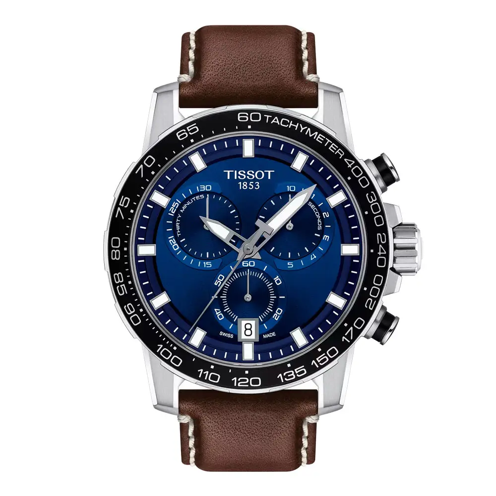 Die Tissot Supersport Chrono ist eine markante Herrenuhr für einen aktiven Lebensstil. Sie verfügt über ein großes 45,5-mm-Edelstahlgehäuse, ein blaues Zifferblatt mit kontrastierenden Totalisatoren und ein braunes Lederarmband mit Dornschließe. Eine Tachymeterskala, Super-LumiNova®-Leuchtzeiger und -Indizes sowie ein robuster Look unterstreichen den sportlichen Charakter.