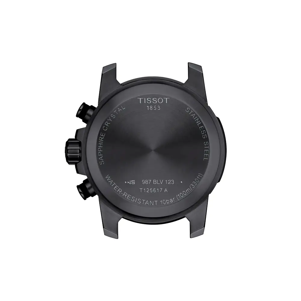 Der Tissot Supersport Chrono besticht durch sein markantes, modernes Design und maskuline Eleganz. Das 45,5 mm Edelstahlgehäuse mit schwarzer PVD-Beschichtung unterstreicht seine robuste Ausstrahlung, während das schwarze Zifferblatt mit kontrastierenden Zeigern und Indizes für perfekte Ablesbarkeit sorgt.