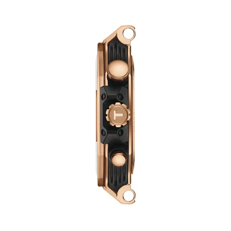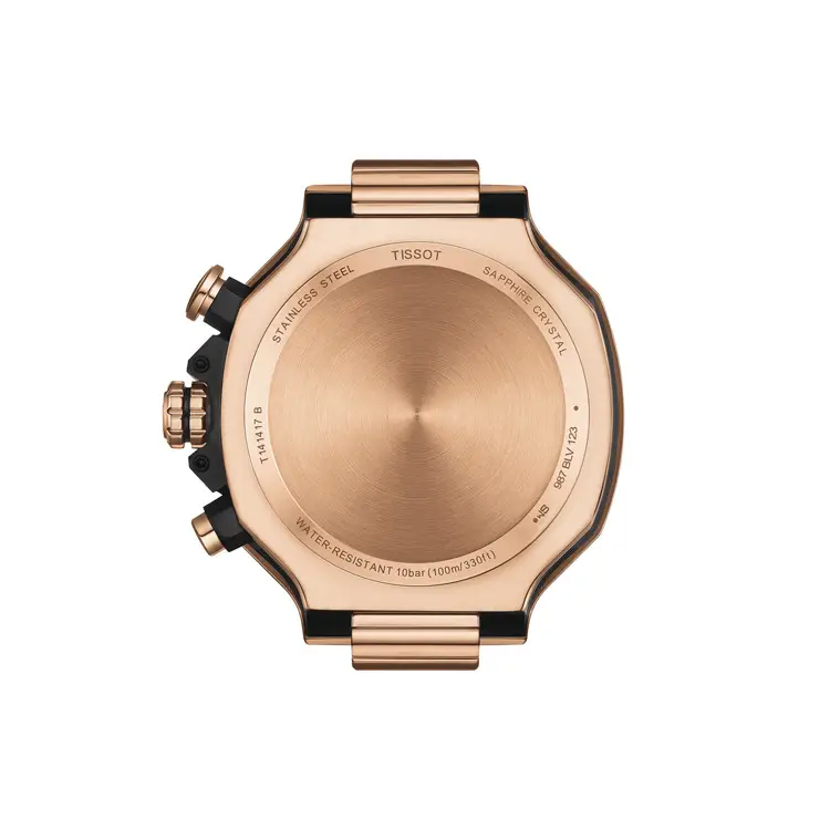 Die Tissot T-Race Chronograph T141.417.37.051.00 ist ein sportliches Modell, das von der Welt des Motorradrennsports inspiriert ist. Das markante 45-mm-Gehäuse aus 316L-Edelstahl mit roségoldener PVD-Beschichtung wird durch ein schwarzes Zifferblatt mit kontrastreichen Details ergänzt, die Dynamik und Leistung unterstreichen. Design-Elemente wie die bremsscheibenförmige Lünette und die lenkerähnlichen Drücker verweisen auf das Racing-Erbe der Kollektion.