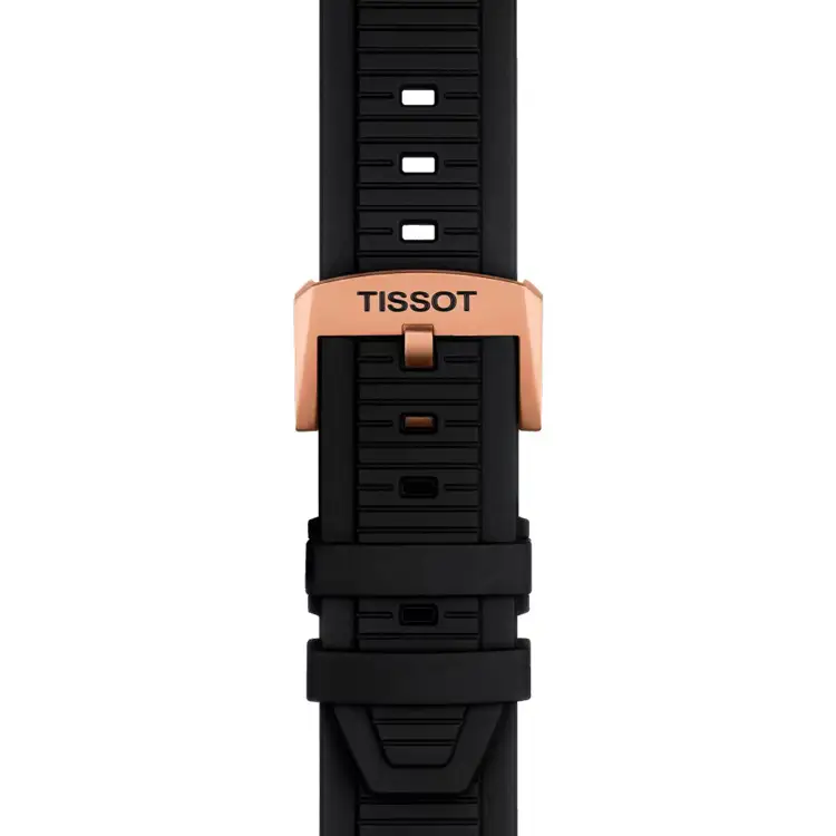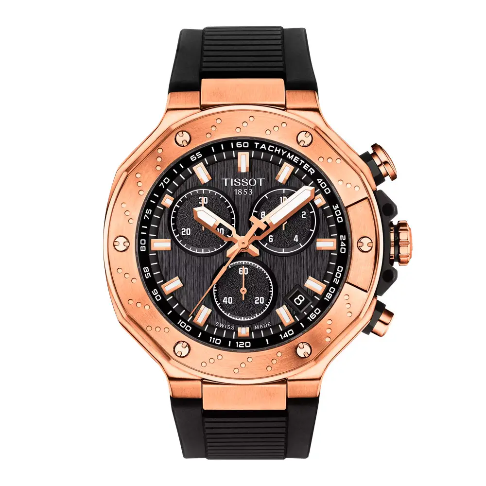 Das schwarze Kautschukarmband sorgt für Komfort und einen modernen Look. Die Tissot T-Race Chronograph in Schwarz und Roségold steht für Energie, Präzision und Schweizer Qualität – ideal für alle, die Leistung und Stil schätzen.