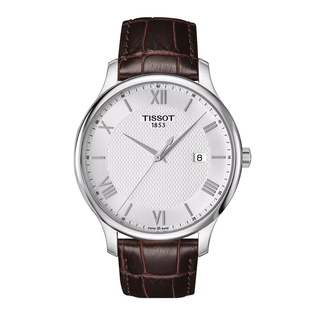 Die Tissot Tradition T063.610.16.038.00 verbindet klassisches Design mit moderner Eleganz und Schweizer Präzision. Das 316L-Edelstahlgehäuse mit einem Durchmesser von 42 mm verleiht der Uhr eine markante, ausgewogene Präsenz. Das silberne Zifferblatt mit römischen Ziffern und feinen Indizes sorgt für einen zeitlosen und anspruchsvollen Look, der durch ein bequemes braunes Lederarmband ergänzt wird.