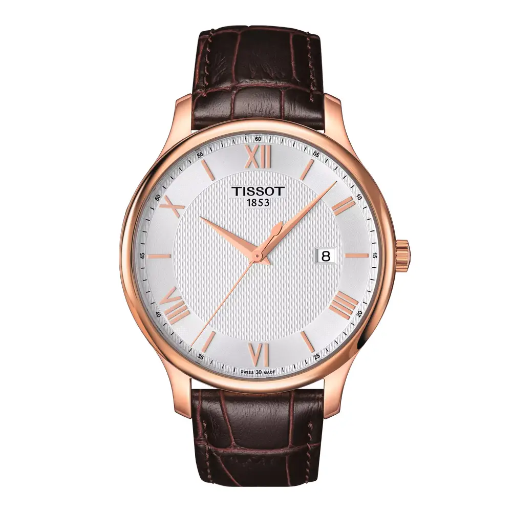 Die Tissot Tradition T063.610.36.038.00 präsentiert eine elegante Interpretation klassischer Herrenuhren und verbindet Schweizer Tradition mit modernem, raffiniertem Design. Das 316L-Edelstahlgehäuse mit roségoldener PVD-Beschichtung und ein Durchmesser von 42 mm verleihen der Uhr eine anspruchsvolle Präsenz, während das silberne Zifferblatt mit feinen römischen Ziffern ihre zeitlose Eleganz unterstreicht. Ein hochwertiges braunes Lederarmband rundet den harmonischen Gesamteindruck ab.