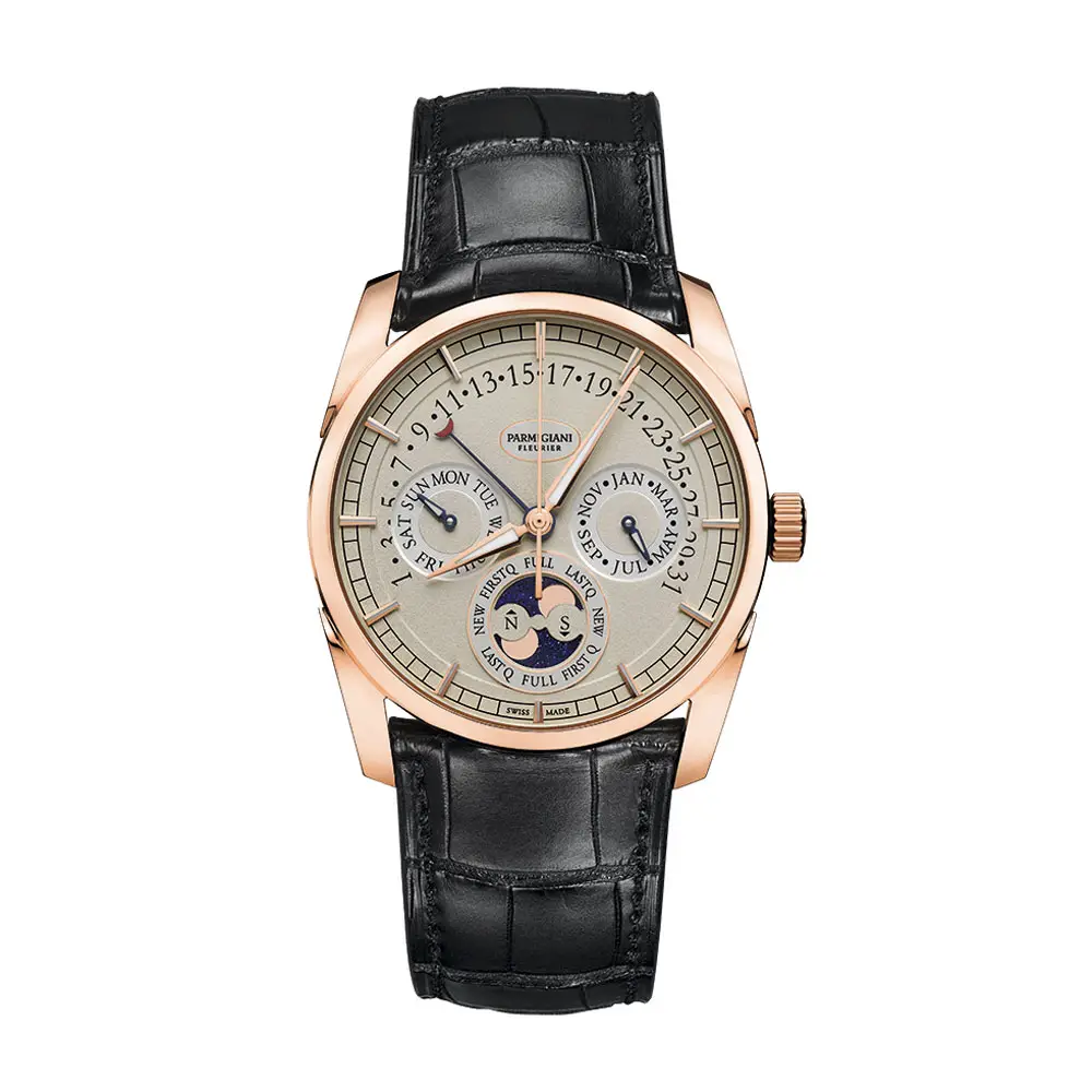 Die Parmigiani Fleurier Tonda Calendrier Annuel, Referenz PFC272-1002401-HA1242, ist ein Meisterwerk der Schweizer Haute Horlogerie und vereint klassische Eleganz, fortschrittliche Mechanik und außergewöhnliches Uhrmacherhandwerk. Dieses 40-mm-Modell besteht aus 18kt Roségold, was ihm ein warmes, luxuriöses Aussehen verleiht, das durch ein handgenähtes braunes Hermès-Alligatorlederarmband noch verstärkt wird.