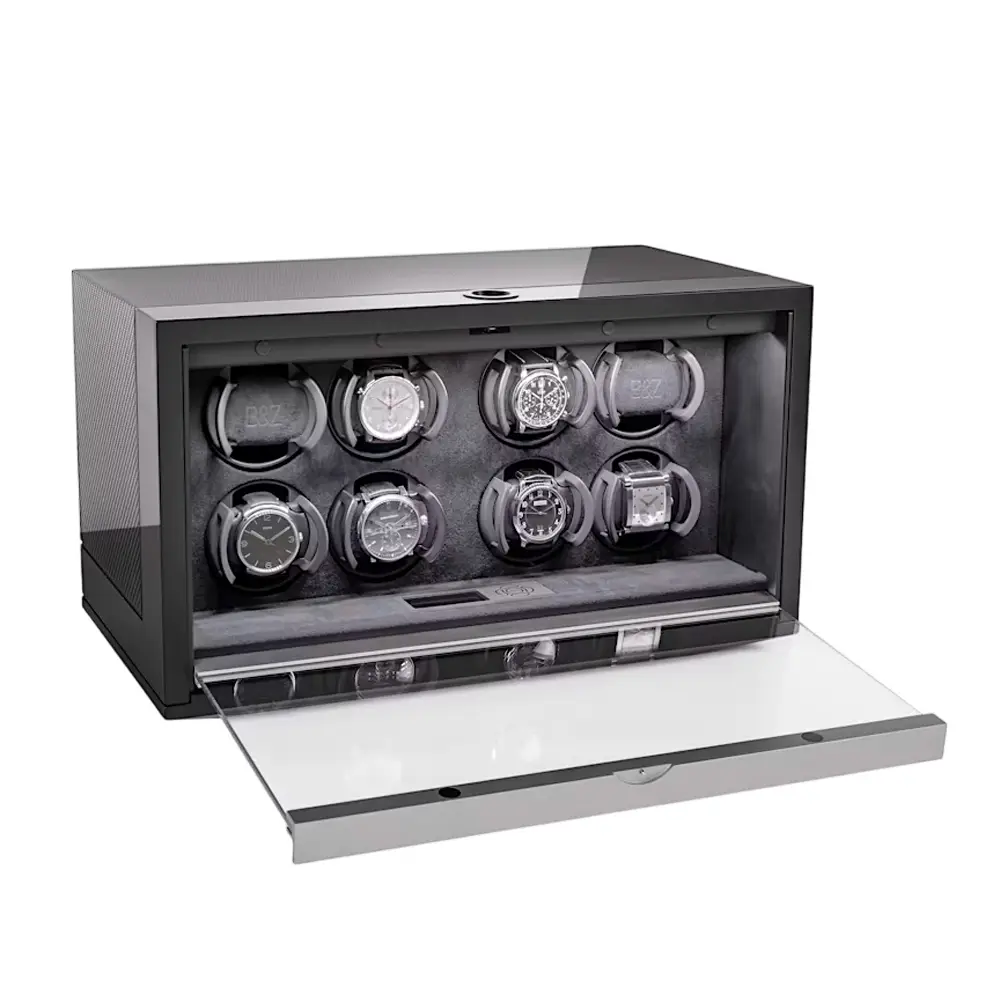 Der Buben & Zorweg NEO 8 Carbon Matte ist ein luxuriöser, technologisch fortschrittlicher Uhrenbeweger für anspruchsvolle Sammler automatischer Uhren. Er bietet Platz für acht Uhren im Time Mover®-System, das sie stets aufgezogen und einsatzbereit hält.