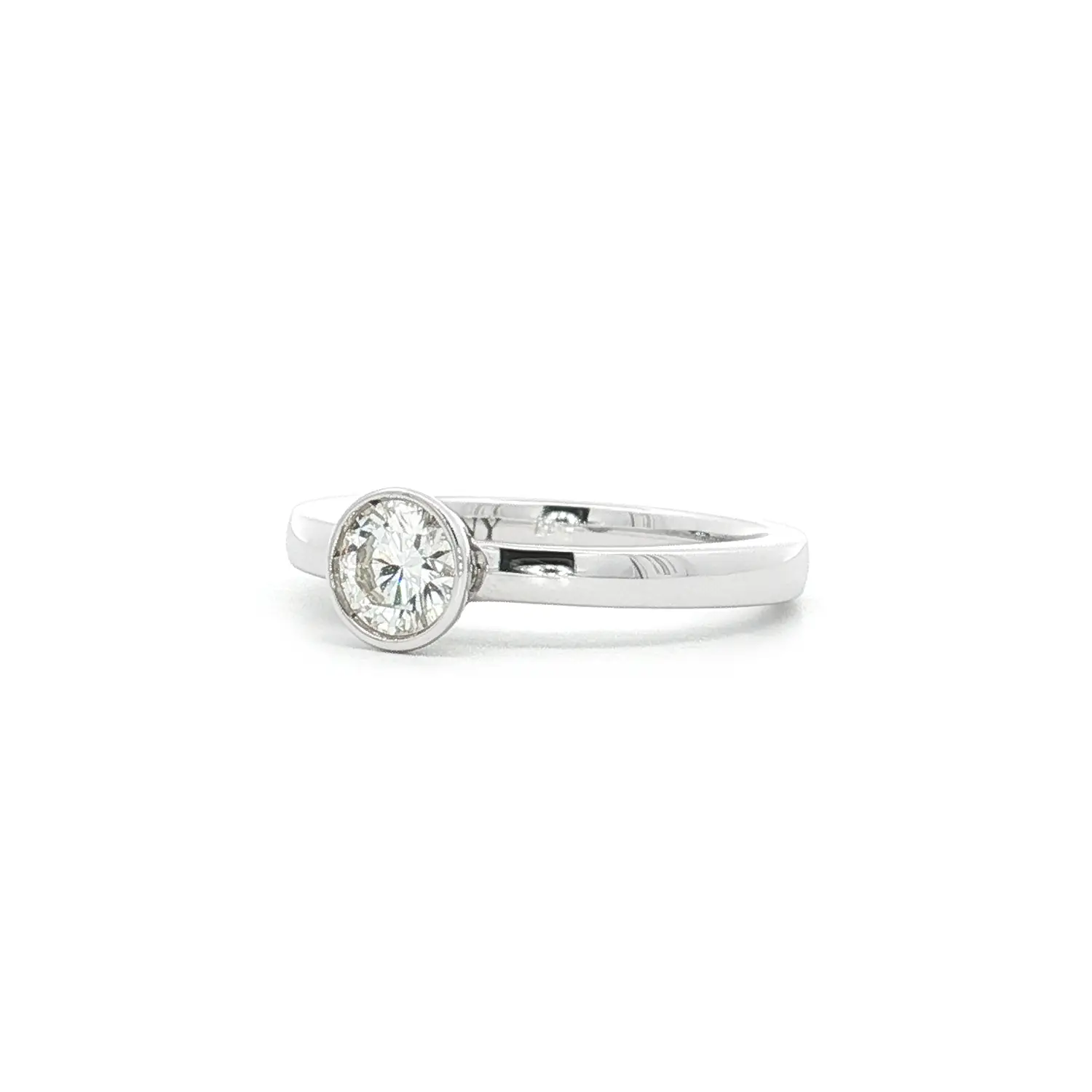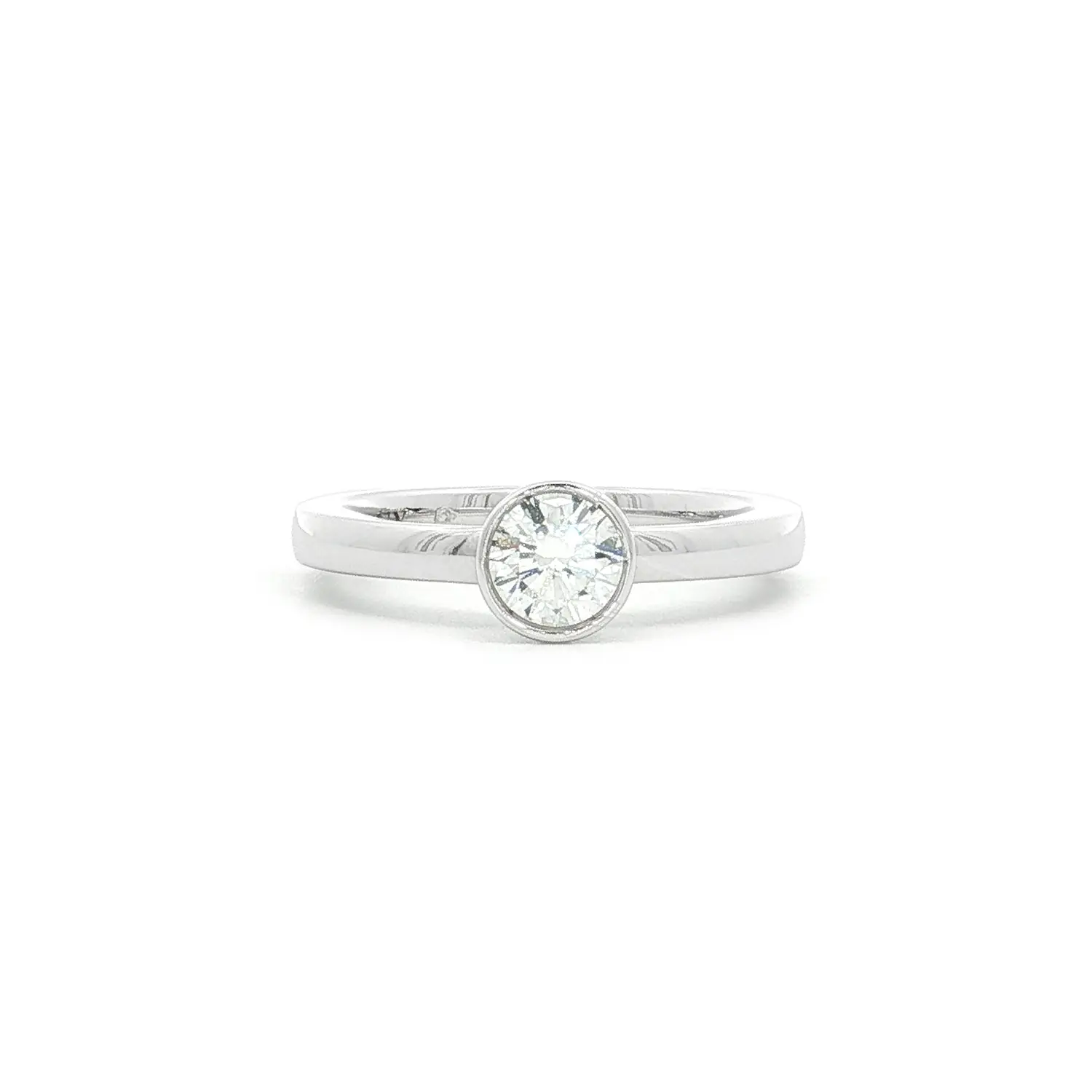 Dieser Verlobungsring aus Weißgold mit einem 0,52 Karat Brillanten steht für schlichte Eleganz und zeitlose Schönheit. Der zentrale Diamant ist in eine glatte Fassung eingefasst, die ihn schützt und gleichzeitig sein funkelndes Licht perfekt zur Geltung bringt. Das klare, moderne Design lenkt alle Aufmerksamkeit auf den Stein – ein Symbol für reine und beständige Liebe.