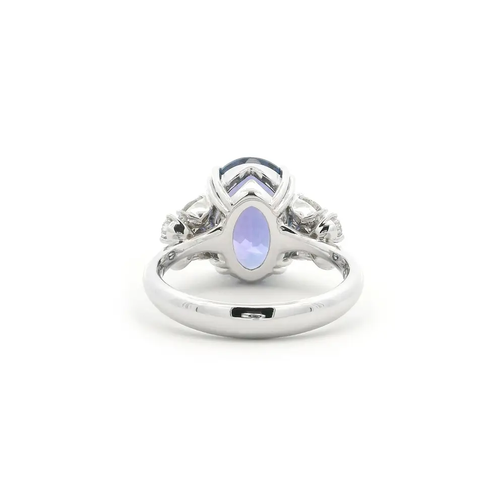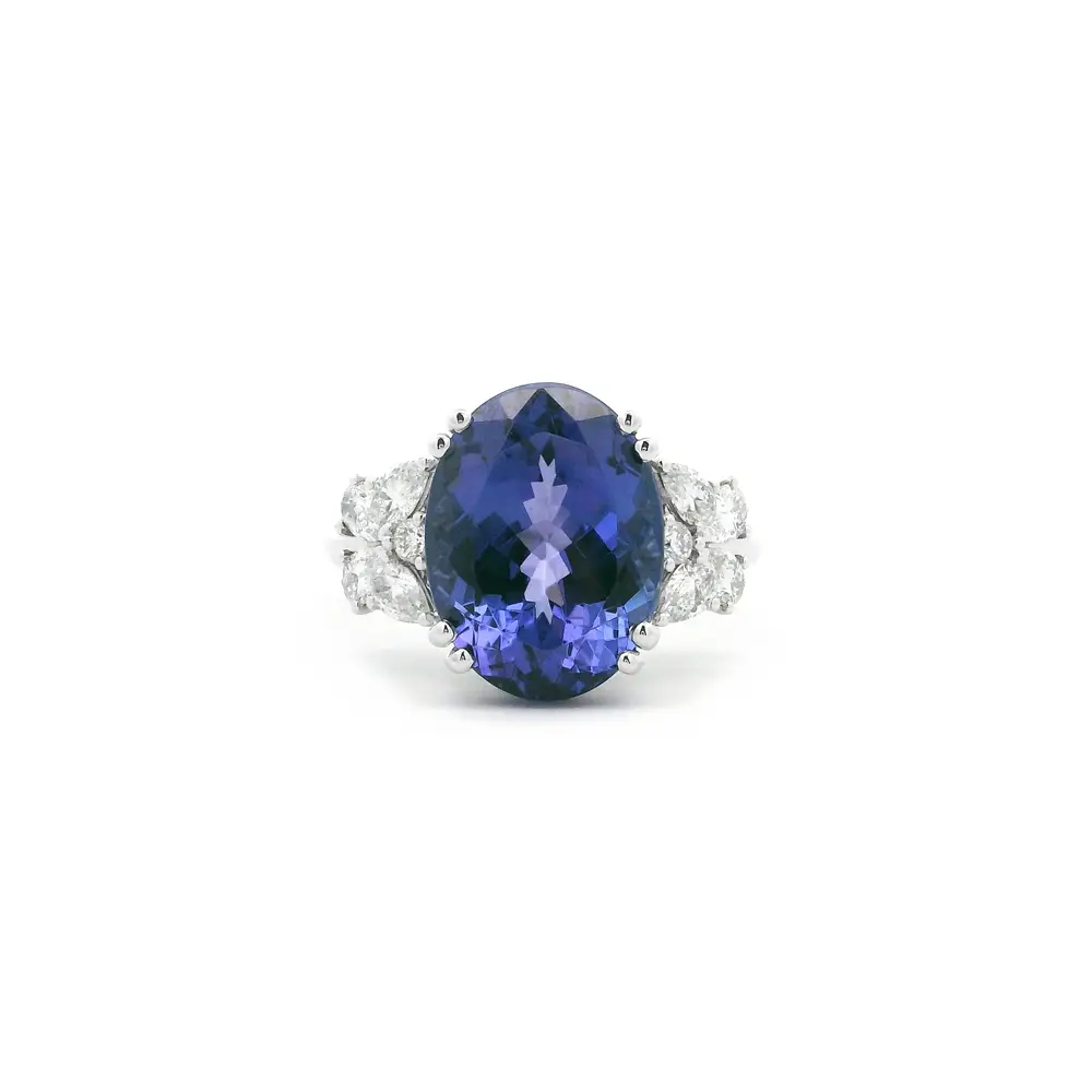Dieser elegante Ring aus 18-karätigem Weißgold vereint Anmut und Luxus in perfekter Harmonie. Im Mittelpunkt steht ein ovaler Tansanit, dessen faszinierende Farbnuancen von Blau bis Violett reichen – ein Symbol für Einzigartigkeit und innere Stärke.