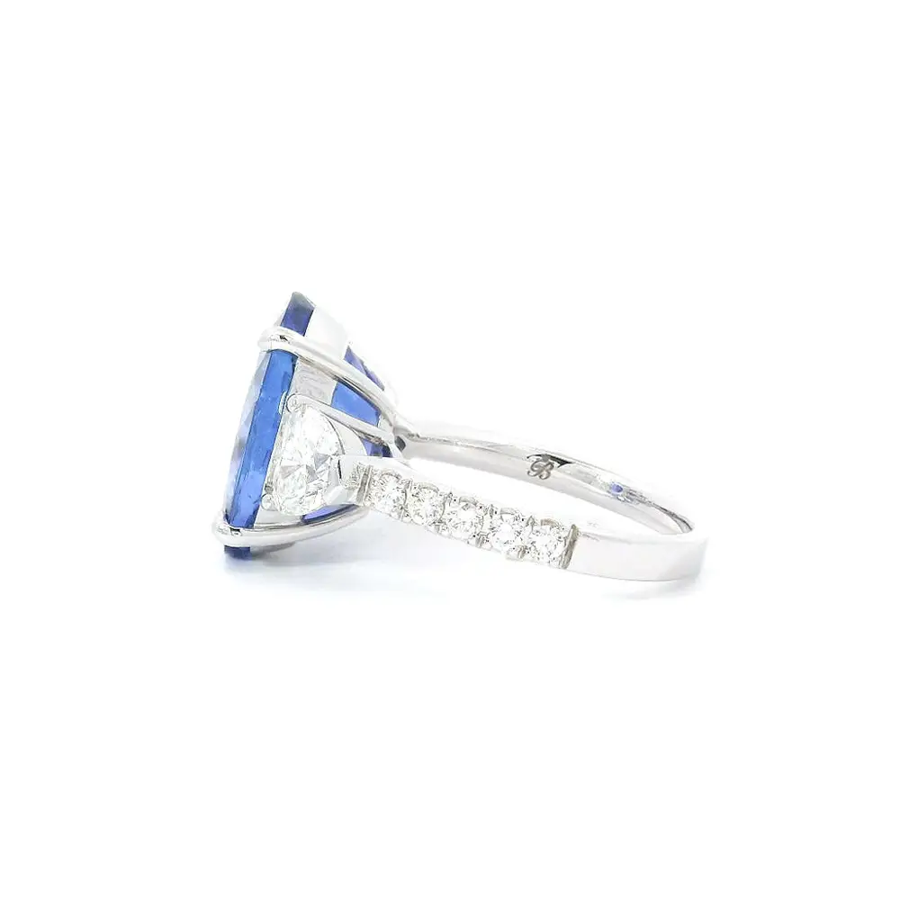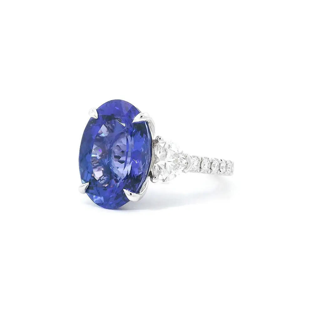 Dieser außergewöhnliche Ring aus 18 Karat Weißgold ist ein Fest der Seltenheit, der Eleganz und der weiblichen Stärke. Das Schmuckstück wird von einem wunderschönen ovalen Tansanit mit einem Gewicht von 9,11 ct dominiert, dessen tief violett-blauer Farbton auf den ersten Blick verzaubert.