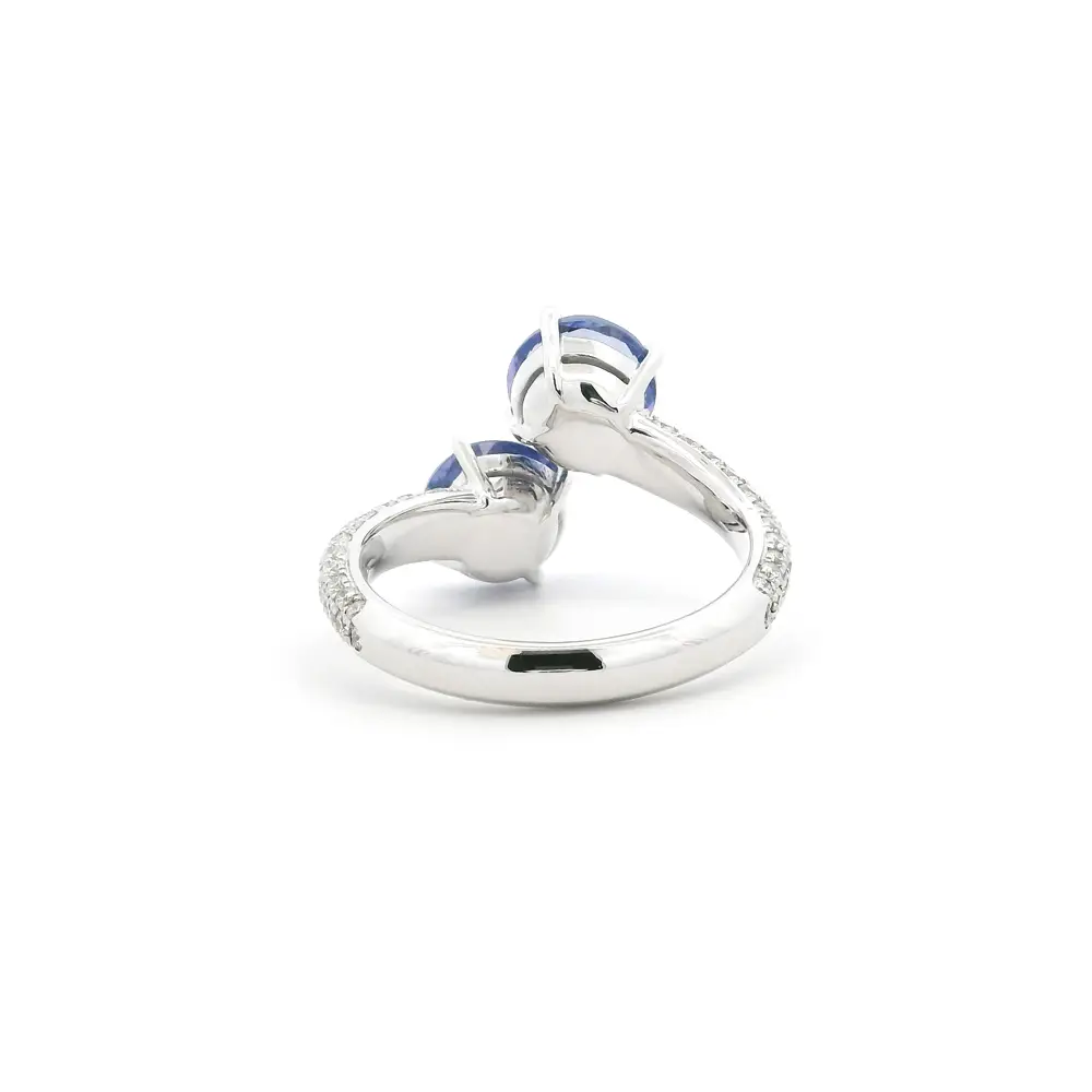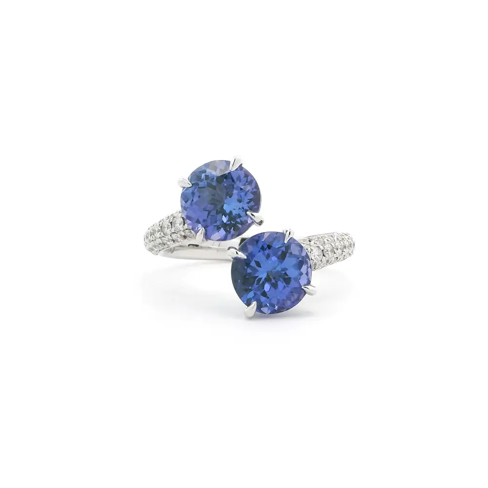 Dieser außergewöhnliche Ring aus 18-karätigem Weißgold vereint Eleganz, Originalität und Harmonie. Das offene Design wird von zwei runden Tansaniten geziert, die Dualität, Ausgewogenheit und die Verbindung zweier Seelen symbolisieren. Ihre violett-blauen Nuancen verändern sich je nach Licht und entfalten ein faszinierendes Farbspiel.