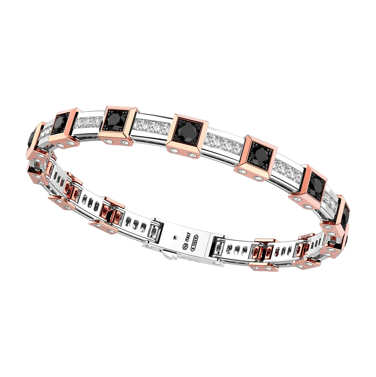 Das Schmuckstück ist reich mit Diamanten besetzt – schwarze Diamanten mit einem Gesamtgewicht von 5,50 ct und weiße Diamanten mit 2,60 ct –, die in kontrastierenden Flächen eingesetzt sind und ein beeindruckendes Spiel aus Licht und Tiefe erzeugen. Präzise Handfassung, massive Verarbeitung und ein sicherer Verschluss unterstreichen den exklusiven Charakter dieses Armbands. Das Zancan Couture Sapphire EB710BR richtet sich an Männer, die ausdrucksstarken Luxus und kompromisslose Qualität schätzen.