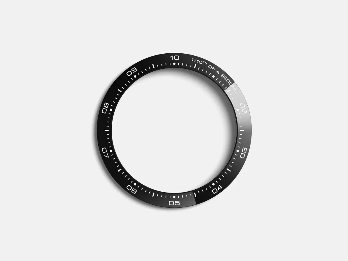 Das weiße analoge Zifferblatt verfügt über drei Hilfszifferblätter, klassische Zeiger sowie eine Chronographenfunktion und eine Datumsanzeige, die harmonisch in das Design eingebettet sind. Die schwarze Keramiklünette mit Tachymeterskala betont den sportlichen Charakter und bietet zugleich hohe Kratzfestigkeit.