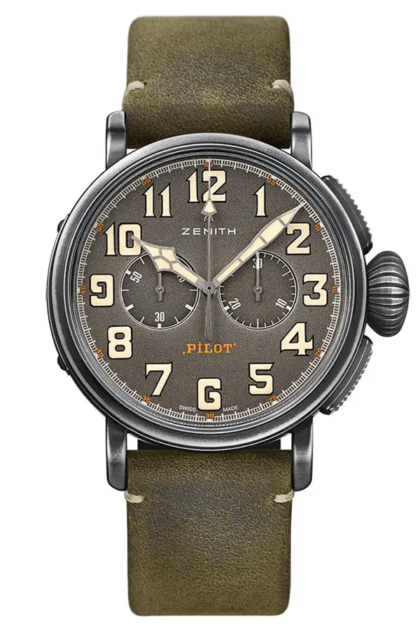 Die Kollektion Zenith Pilot ist inspiriert von der reichen Geschichte der Marke im Bereich der Fliegeruhren, die bis ins frühe 20. Jahrhundert zurückreicht. Zenith ist eine der wenigen Marken, die den Namen "Pilot" direkt auf dem Zifferblatt verwenden dürfen - und das zu Recht, denn ihr Bordchronograph begleitete 1909 den berühmten Flug von Louis Blériot über den Ärmelkanal.